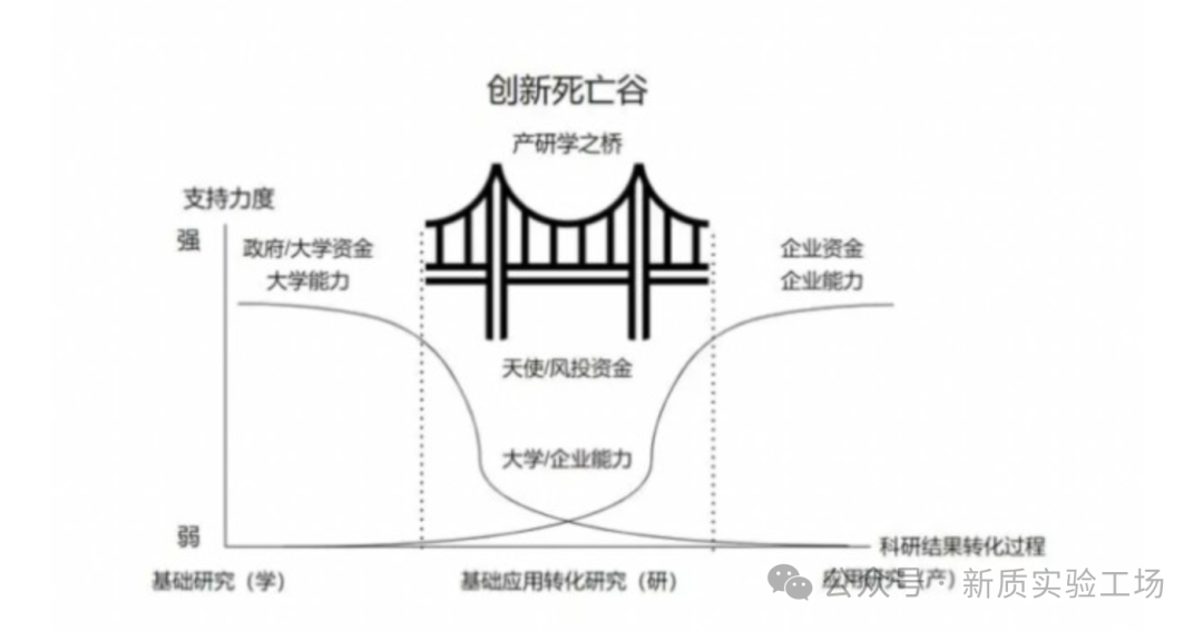 在科研到成果转化、成果转化到产业化之间存在着“死亡之谷”。“创新死亡谷”是指从TRL 4(实验室环境中组件或模型的验证)到 TRL 6(相关环境下的系统/子系统模型或原型演示)的特殊过程, 这个阶段特别容易出现资金短缺、市场需求不确定性以及技术和商业双重挑战等问题。成功穿越这一阶段意味着技术已经具备较高的成熟度,可以准备进入市场或者大规模生产阶段(即TRL7 及以上)