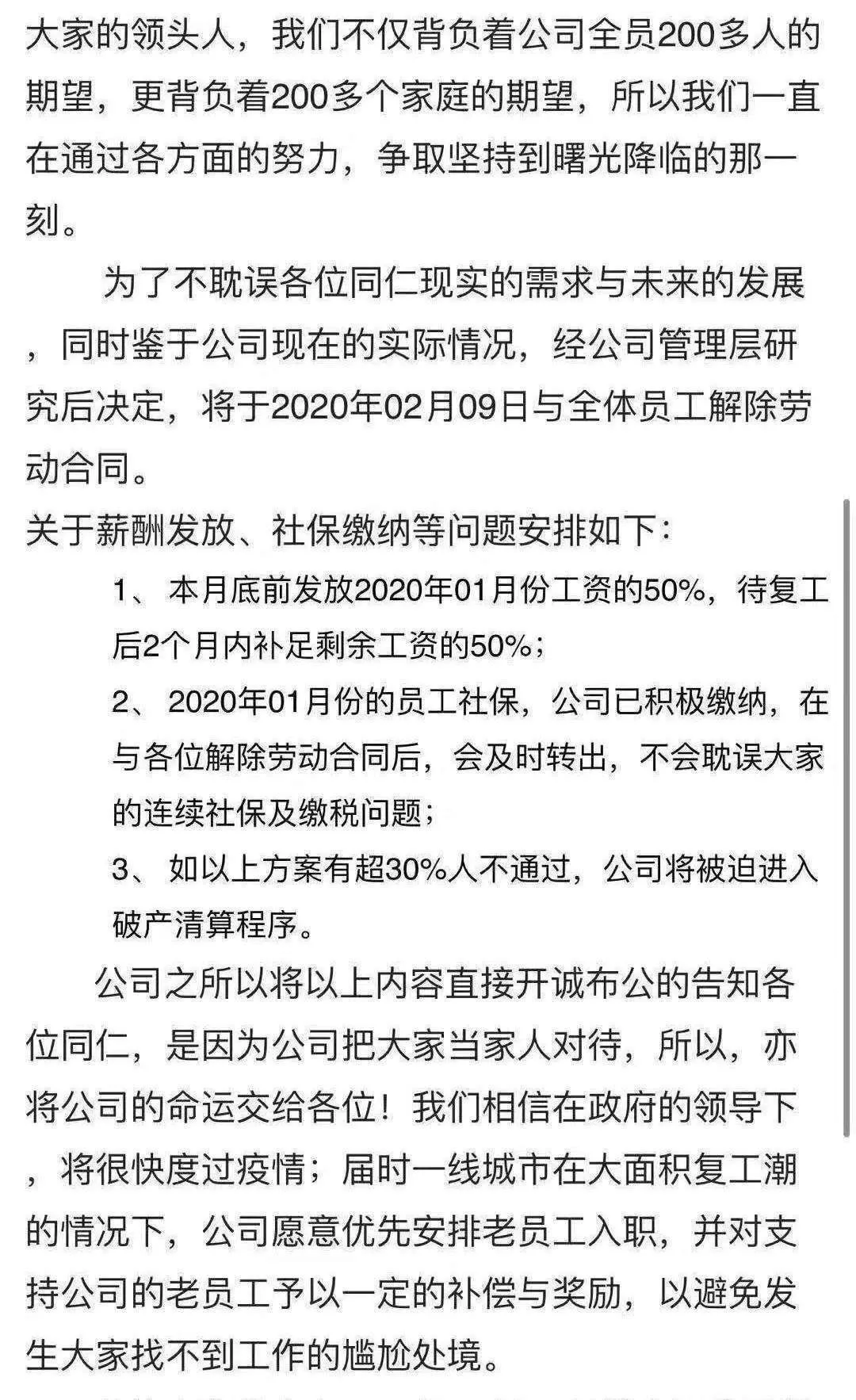 受疫情影响,K歌之王宣布将于2月9日,也就是北京市准备正式上班的前一天,与全部员工、200多名员工解除劳动合同,如果有30%员工不同意这个方案,公司将进行破产清算。