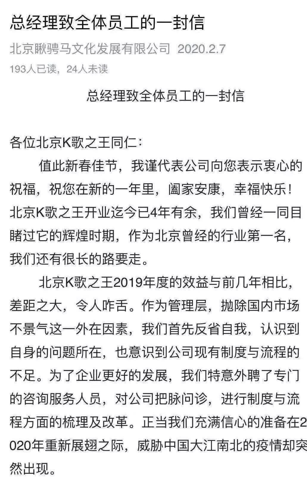 无独有偶,2月7日,北京知名KTV“K歌之王”发布了《总经理致全体员工的一封信》。信中称:“正当我们充满信心的准备在2020年重新展翅之际,威胁中国大江南北的疫情却突然出现。”