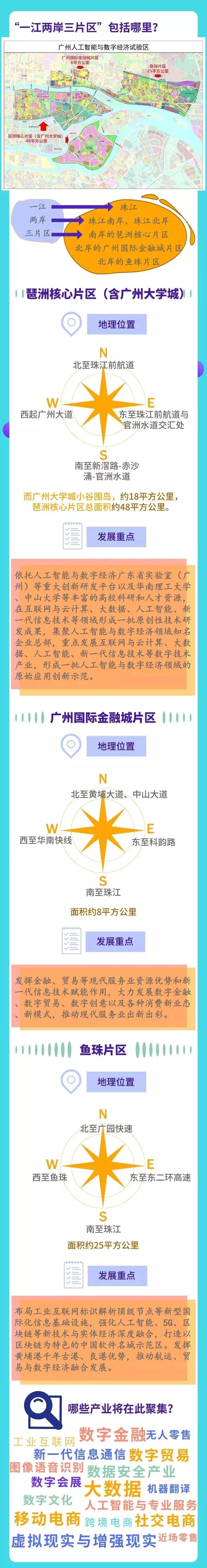 珠江南岸人工智能与数字经济产业创新集聚区,即琶洲核心片区(含广州大学城)(西起广州大道,东至珠江前航道与官洲水道交汇处,北至珠江前航道,南至新滘路-赤沙涌-官洲水道,约30平方公里;广州大学城小谷围岛,约18平方公里),总面积约48平方公里。依托人工智能与数字经济广东省实验室(广州)等重大创新研发平台以及华南理工大学、中山大学等丰富的高校科研和人才资源,在互联网与云计算、大数据、人工智能、新一代信息技术等领域形成一批原创性技术研发成果,集聚人工智能与数字经济领域知名企业总部,重点发展互联网与云计算、大数据、人工智能、新一代信息技术等数字技术产业,形成一批人工智能与数字经济领域的原始应用创新示范。