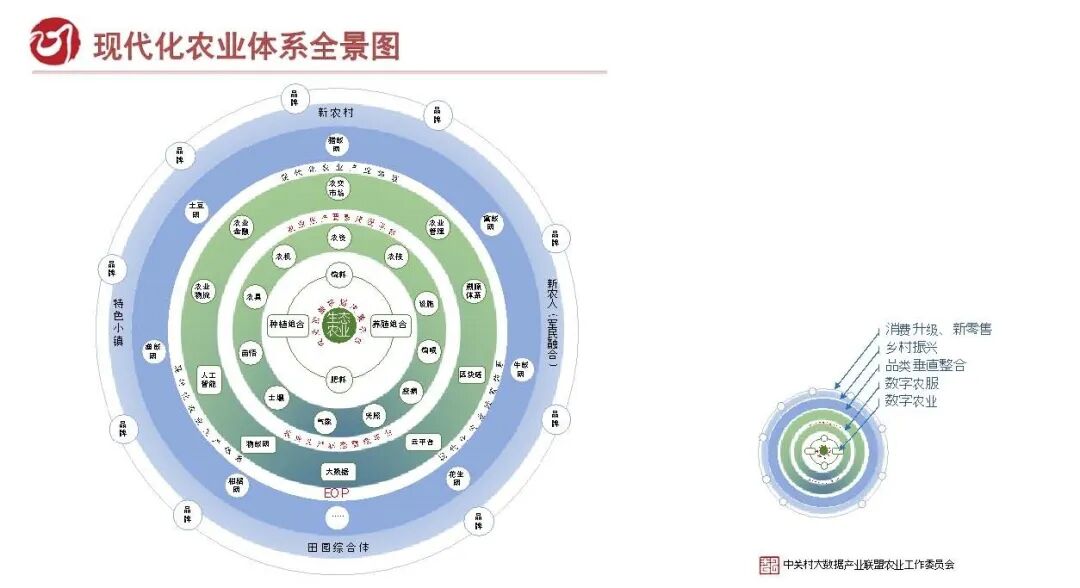 然后再进一步提升,那我们就需要用到一些这个随着信息化的技术,包括人工智能啊,大数据啊,区块链啊,云啊,物联网等等这些东西,那就得到一个很大的一个用途。但这个东西具备之后,具备这个基础,我们把这个生产性的服务又捅破到一个统一平台上,又统一了平台之后,事实上又能支撑在农业里面很多很多品类的发展,比如说养殖业发展、种植业,土豆啊,猪联网、禽联网、鱼联网等等等等,你都能够去实践,有了这个基础之后,有了农业这个基础,我们就能建设新农村,这是我一直坚持的一个观点。什么叫农村,一定是农业从事农业的人聚集的地方,居住的地方就是农村。如果没有新的农业的话,我们很难有新农村。淘宝村的李屋村,严格意义上来讲,他不是农村的升级,还是城市的延伸。在这个体系里面,我们看到他的就业的这个要素,对人力的需求还是非常多的,也得需要科技人才啊,农业技术人才,但也需要大量的农业生产人才,而且有精英人才。毕竟这个小微企业涉农的一些工业企业都可以在农村里去聚集,去做,而且属于带来一个整个农村面貌的一个改变啊。虽说他对解决三农的问题也会有很大的一个帮助,但这个问题解决之后,我们农民真的变富裕,真的变好了之后事实上,身上你就能够带了这个消费升级、销售的问题都能解决。这个是呢?整个的我们讲的现代化农业体系全景图。从里到外了,应该分了几次层次,数字农业、数字农服、品类垂直整合,乡村振兴、消费升级,新零售。